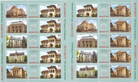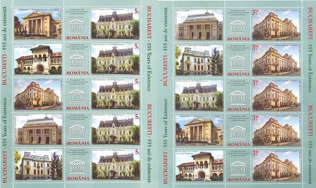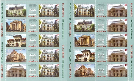 Lp.2040d – Bucuresti 555 de ani de existenta – minicoala de 5 timbre si 5 viniete nestampilata Michel 6867-6872klb
