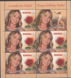 9,99 €Lp.2345 – La multi ani , Nadia !- minicoala de 5 timbre si 1 vinieta nestampilata