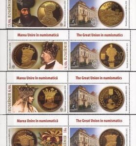 43,99 €LP.2396 – Marea unire in numismatica.- 4 serii cu 2 viniete – coala mare nestampilata