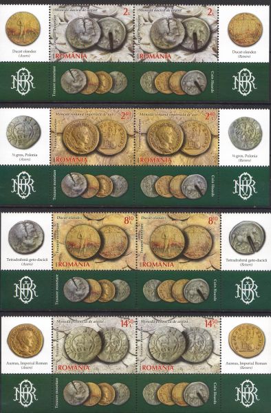 19,99 €Lp.2043b-c – Colectia numismatica a Bancii Nationale a Romaniei , Tezaure Monetare I – 2 serii de timbre cu 1 viniete si 2 tabsuri (diferite)